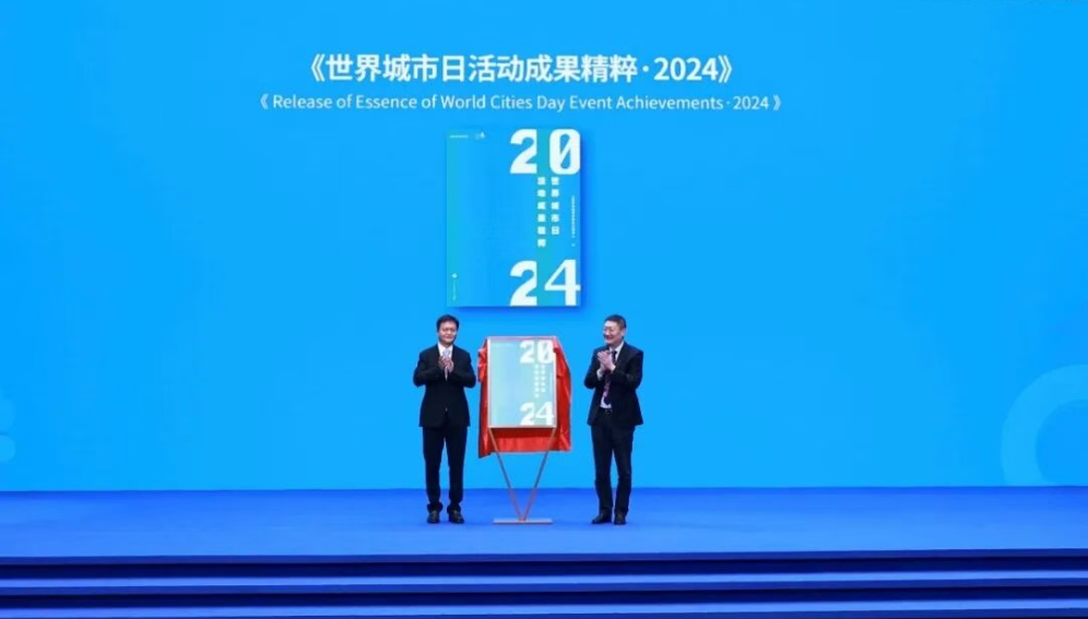 在论坛的成果发布仪式中,上海市住房和城乡建设管理委员会副主任马韧、上海隧道工程股份有限公司副总裁李波共同为《世界城市日活动成果精粹·2024》揭幕。