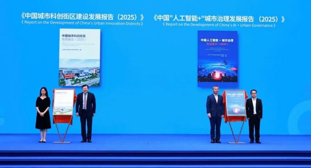 上海交通大学讲席教授、中国城市治理研究院院长、国际与公共事务学院院长吴建南,中国城市治理研究院党支部副书记、国际与公共事务学院党委副书记李振全,中国城市治理研究院谷晓坤研究员,俞俊利副研究员为《中国城市科创街区发展报告(2025)》和《中国“人工智能+”城市治理发展报告(2025)》揭幕。